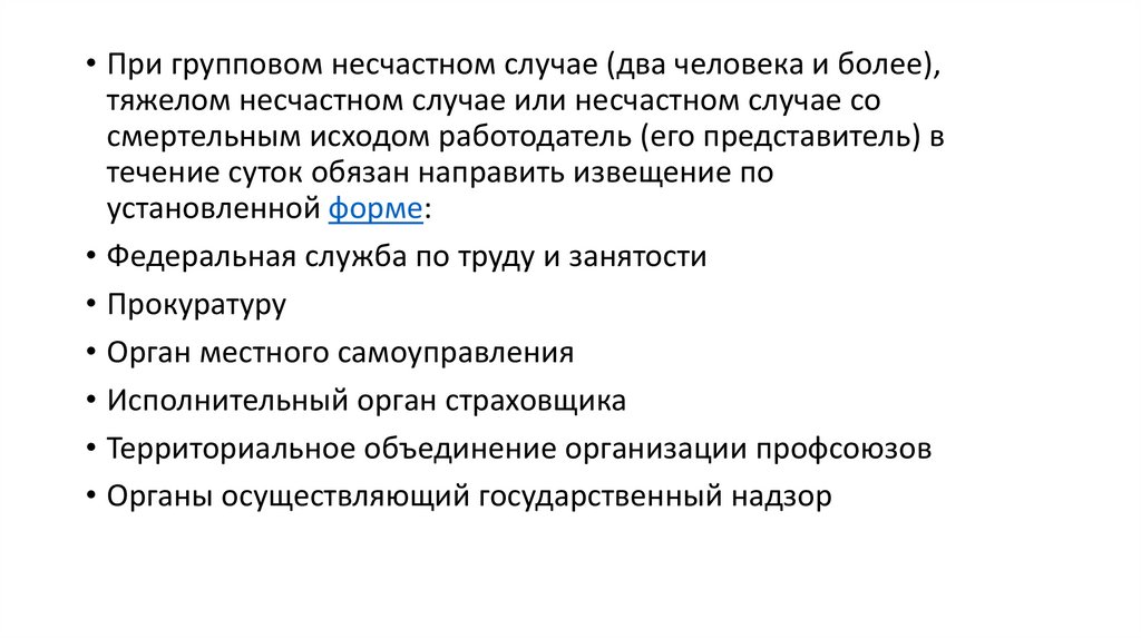 • При групповом несчастном случае (два человека и более),тяжелом несчастном случае или несчастном случае со