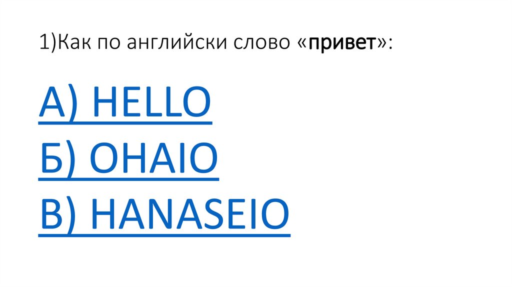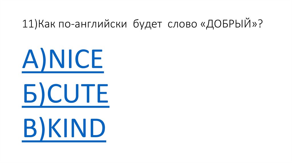 11)Как по-английски будет слово «ДОБРЫЙ»?A)NICE