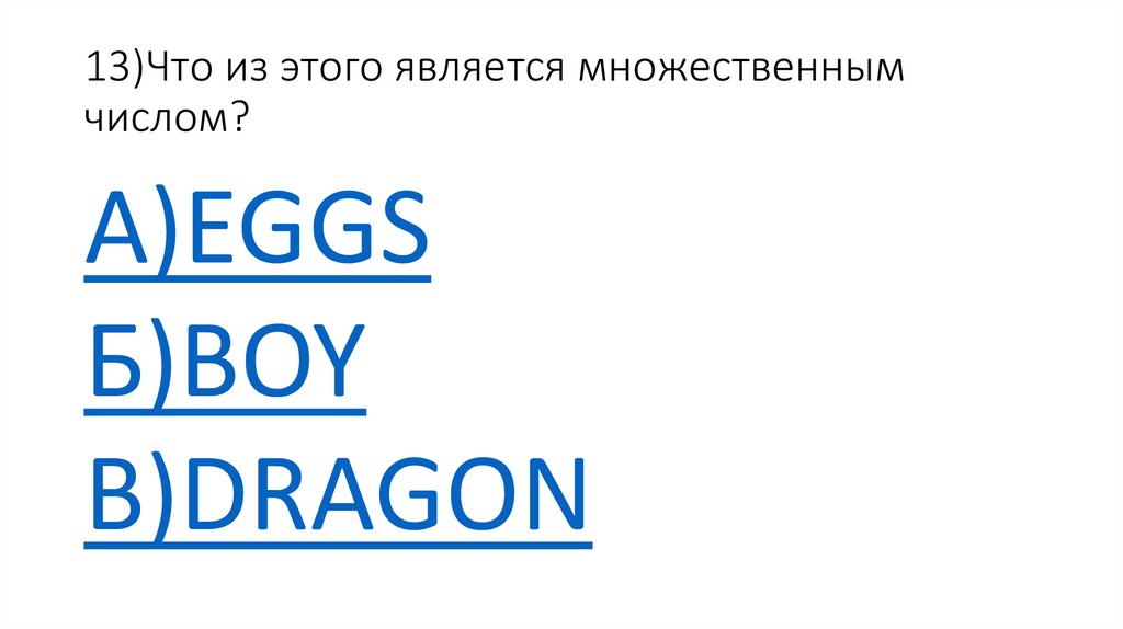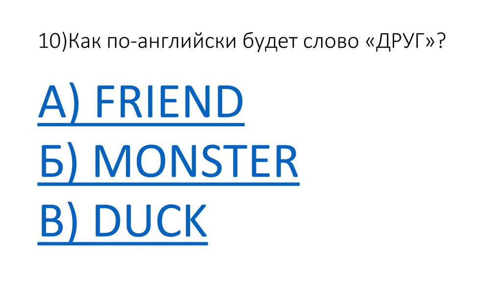 10)Как по-английски будет слово «ДРУГ»?A) FRIEND