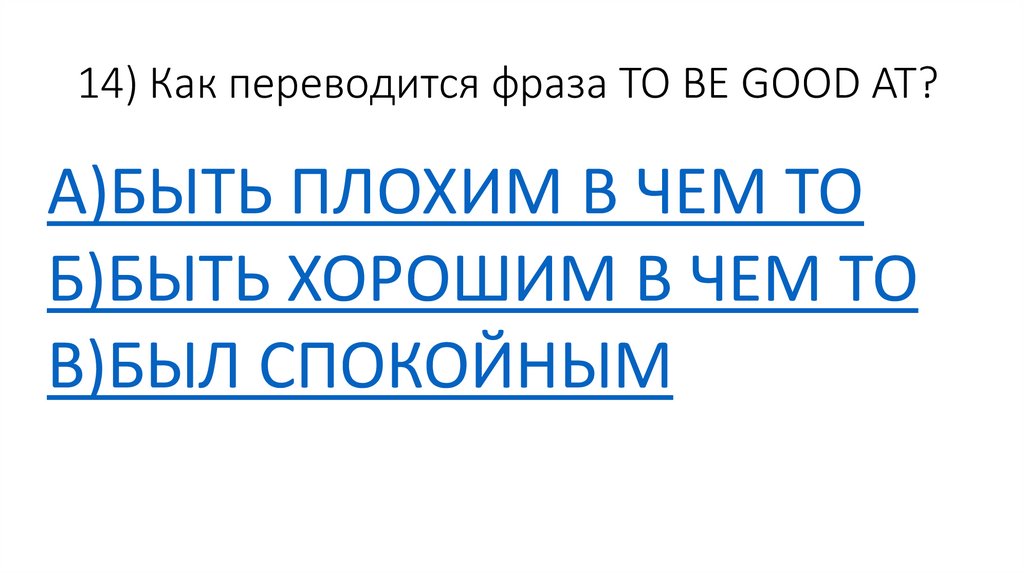 14) Как переводится фраза TO BE GOOD AT?A)БЫТЬ ПЛОХИМ В ЧЕМ ТО