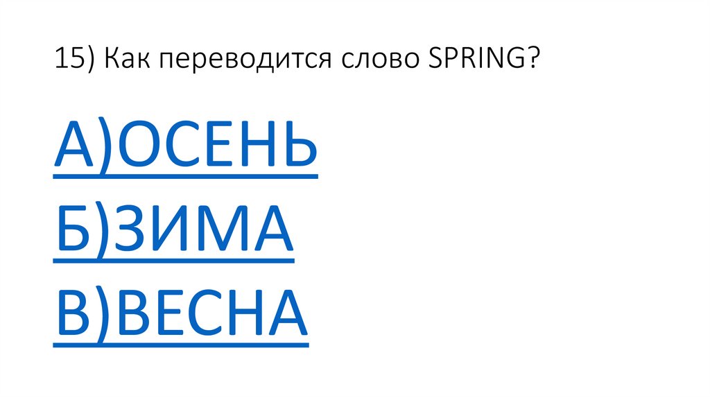 15) Как переводится слово SPRING?A)ОСЕНЬ