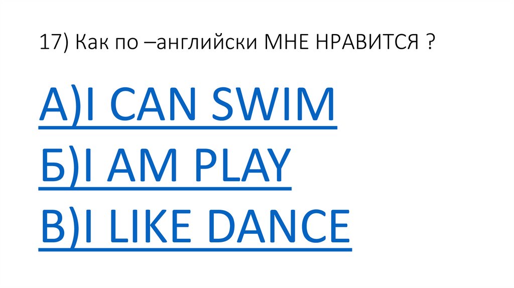 17) Как по –английски МНЕ НРАВИТСЯ ?A)I CAN SWIM
