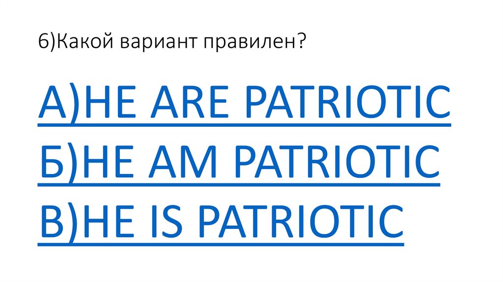 6)Какой вариант правилен?A)HE ARE PATRIOTIC