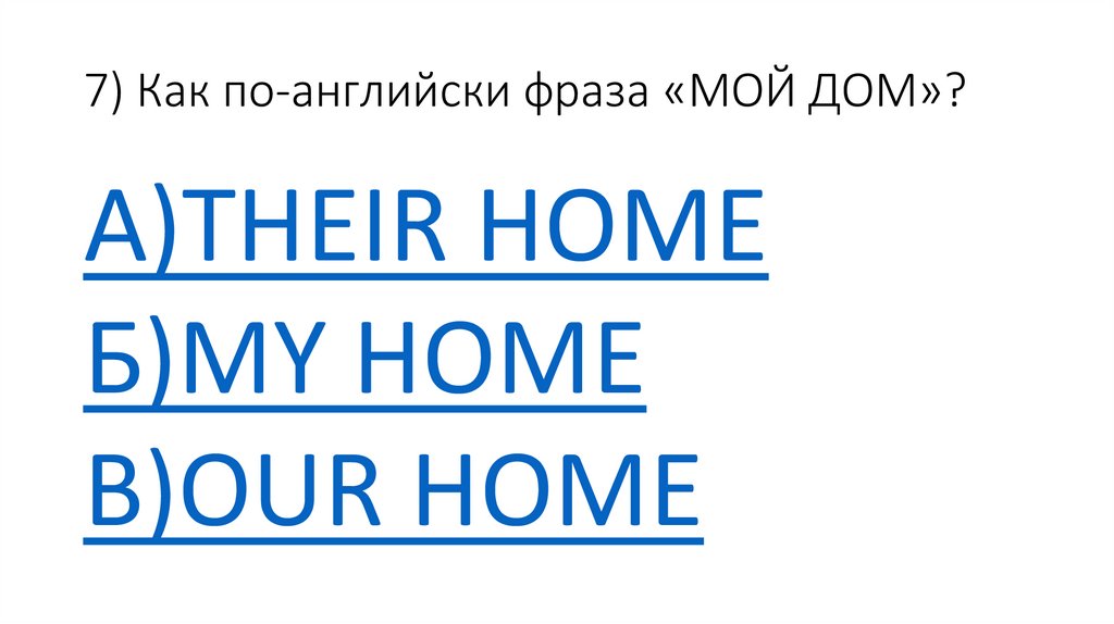 7) Как по-английски фраза «МОЙ ДОМ»?A)THEIR HOME