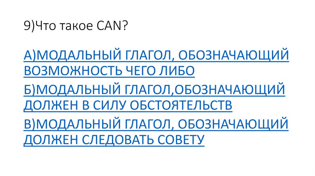 9)Что такое CAN?A)МОДАЛЬНЫЙ ГЛАГОЛ, ОБОЗНАЧАЮЩИЙ