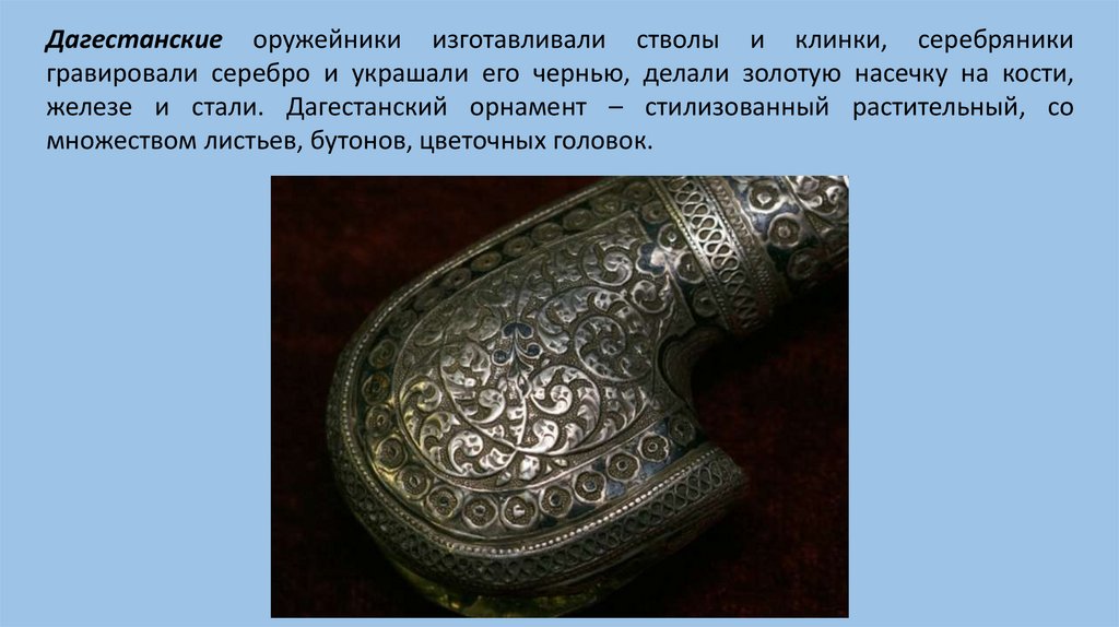 Дагестанские оружейники изготавливали стволы и клинки, серебряникигравировали серебро и украшали его чернью, делали золотую насечку на кости,
