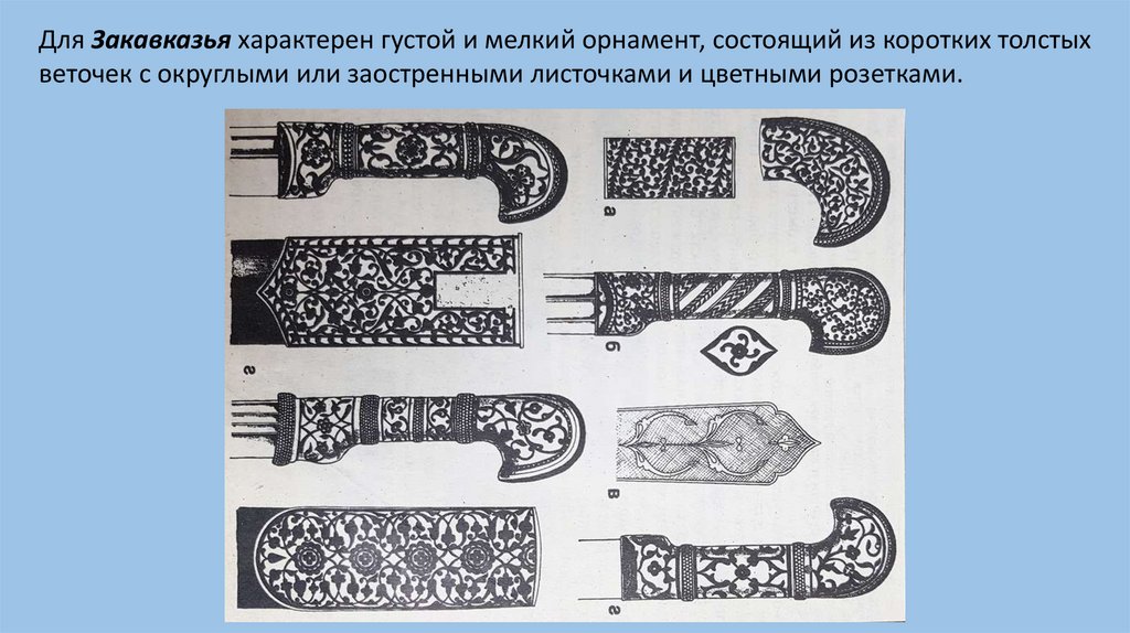 Для Закавказья характерен густой и мелкий орнамент, состоящий из коротких толстыхветочек с округлыми или заостренными листочками и цветными розетками.