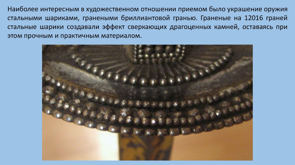 Наиболее интересным в художественном отношении приемом было украшение оружиястальными шариками, гранеными бриллиантовой гранью. Граненые на 12016 граней