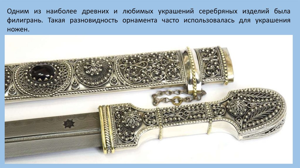 Одним из наиболее древних и любимых украшений серебряных изделий былафилигрань. Такая разновидность орнамента часто использовалась для украшения