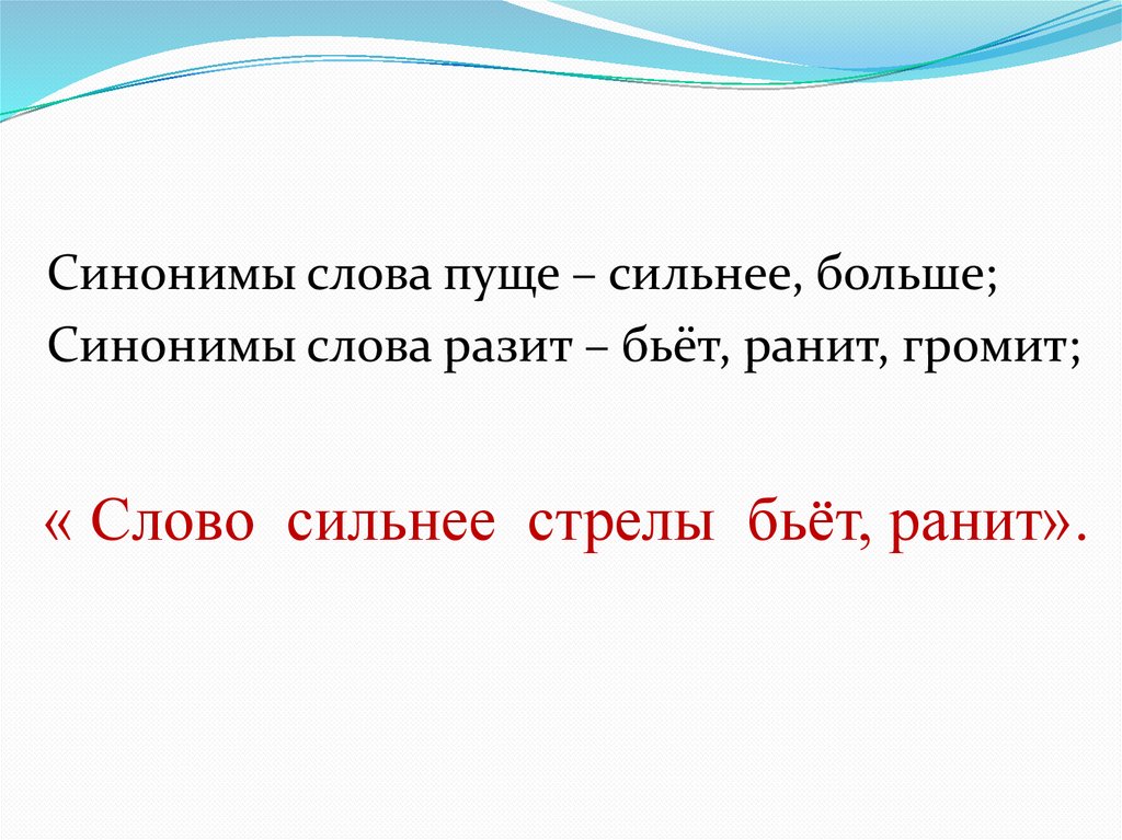 Синонимы слова пуще – сильнее, больше;Синонимы слова разит – бьёт, ранит, громит;