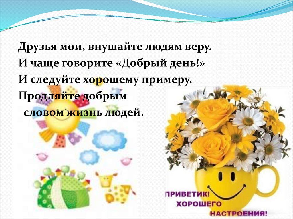 Друзья мои, внушайте людям веру.И чаще говорите «Добрый день!»