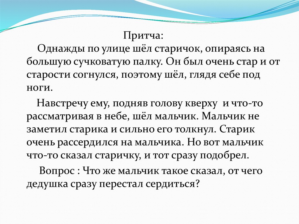 Притча:Однажды по улице шёл старичок, опираясь на