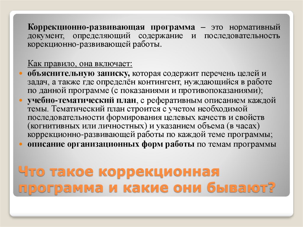 Коррекционно-развивающая программа – это нормативныйдокумент, определяющий содержание и последовательность