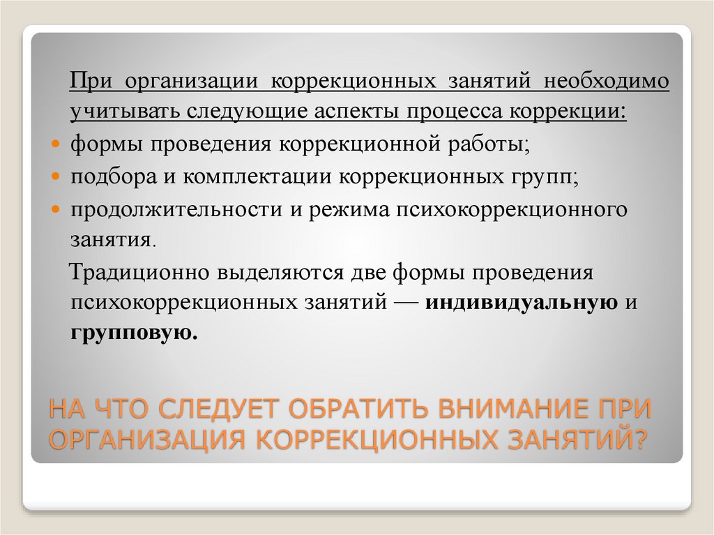 При организации коррекционных занятий необходимоучитывать следующие аспекты процесса коррекции: