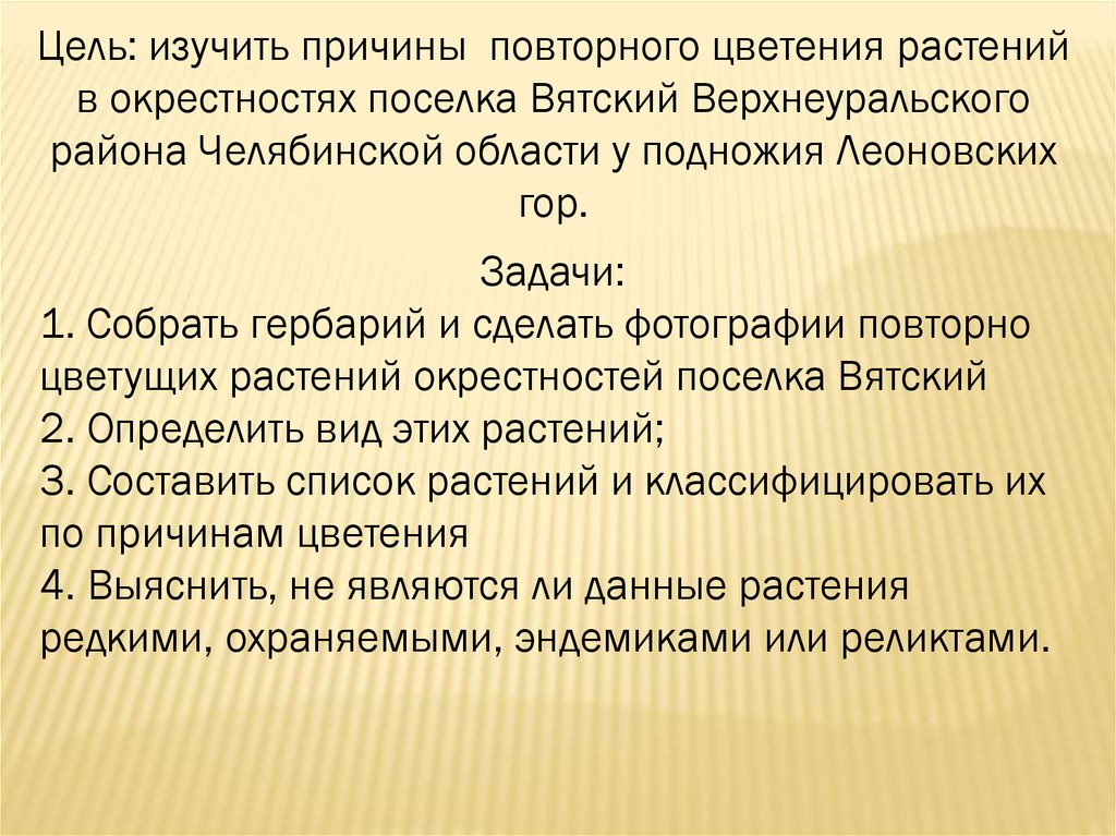 Цель: изучить причины повторного цветения растенийв окрестностях поселка Вятский Верхнеуральского