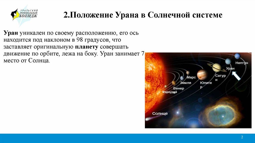 2.Положение Урана в Солнечной системеУран уникален по своему расположению, его ось