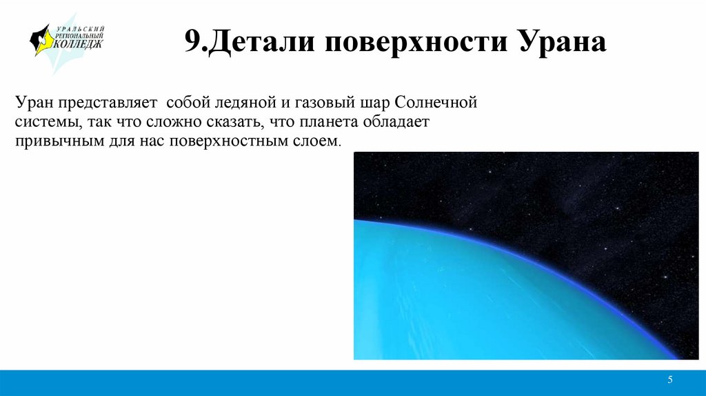 9.Детали поверхности УранаУpaн представляет собой ледяной и газовый шар Солнечной