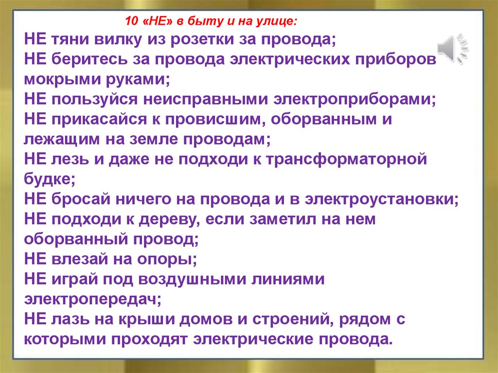 10 «НЕ» в быту и на улице:НЕ тяни вилку из розетки за провода;