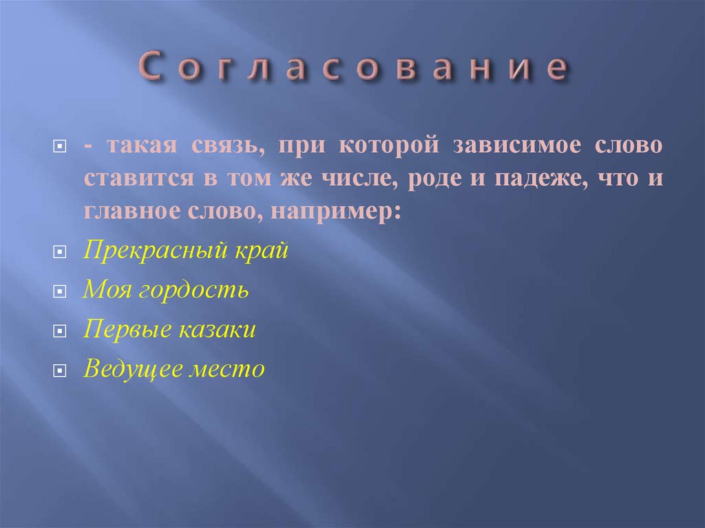 - такая связь, при которой зависимое словоставится в том же числе, роде и падеже, что и