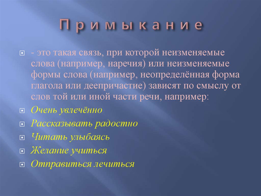 - это такая связь, при которой неизменяемыеслова (например, наречия) или неизменяемые