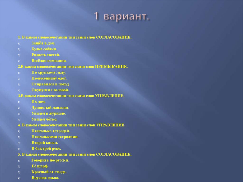 1. В каком словосочетании тип связи слов СОГЛАСОВАНИЕ.1)