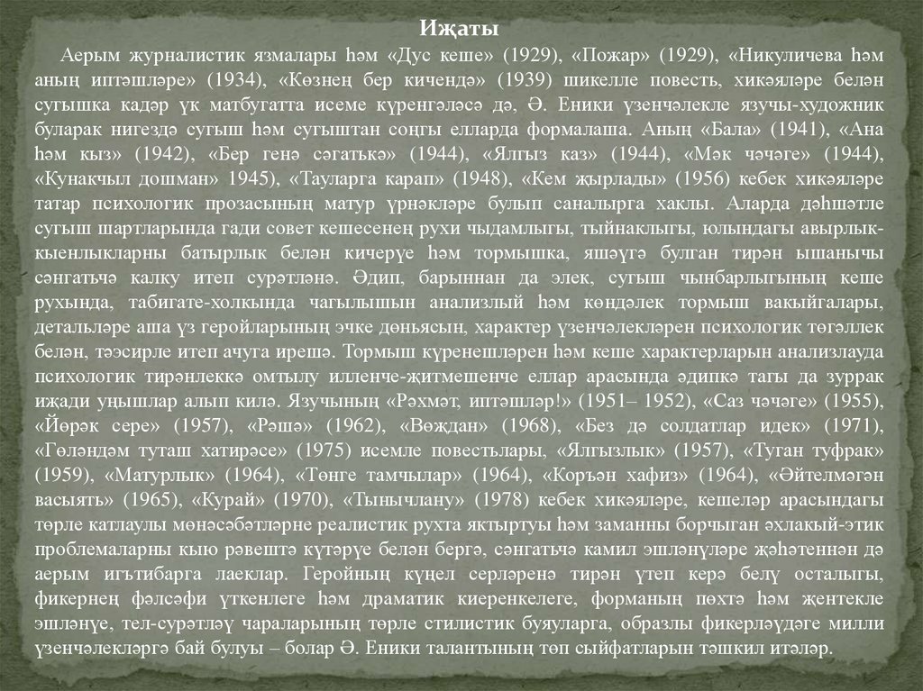 әсәре-– автобиографик материалларга нигезләп язылган «Соңгы китап» исемле документаль