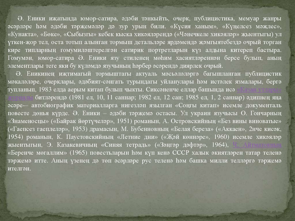 повесте дөнья күрде. Ә. Еники – әдәби тәрҗемә остасы. Ул украин язучысы О. Гончарның