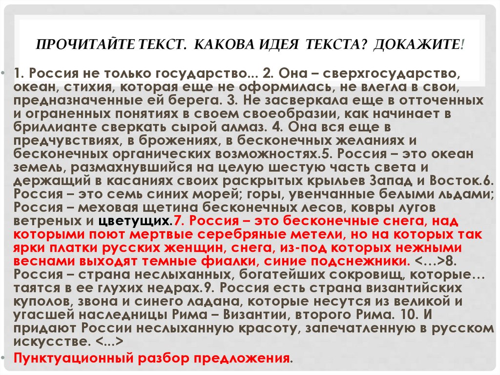 ПРОЧИТАЙТЕ ТЕКСТ. КАКОВА ИДЕЯ ТЕКСТА? ДОКАЖИТЕ!• 1. Россия не только государство... 2. Она – сверхгосударство,