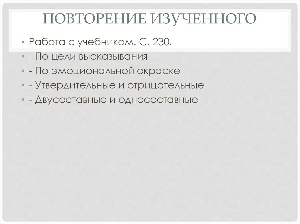 ПОВТОРЕНИЕ ИЗУЧЕННОГОРабота с учебником. С. 230.