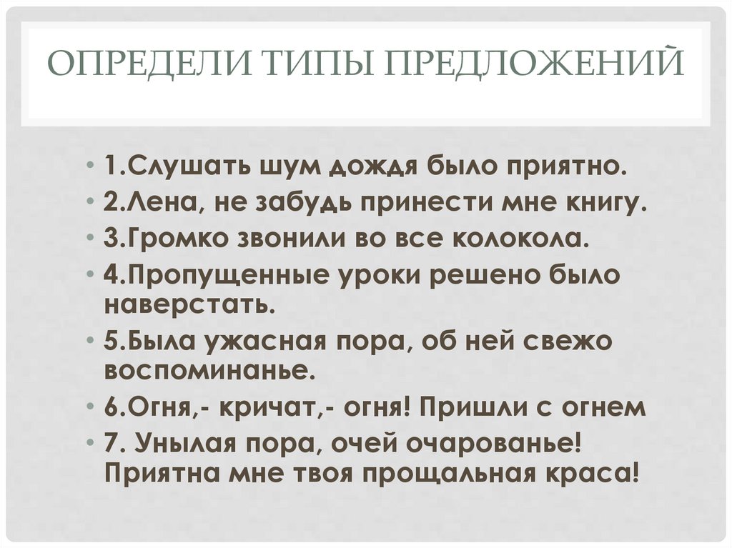 ОПРЕДЕЛИ ТИПЫ ПРЕДЛОЖЕНИЙ1.Слушать шум дождя было приятно.