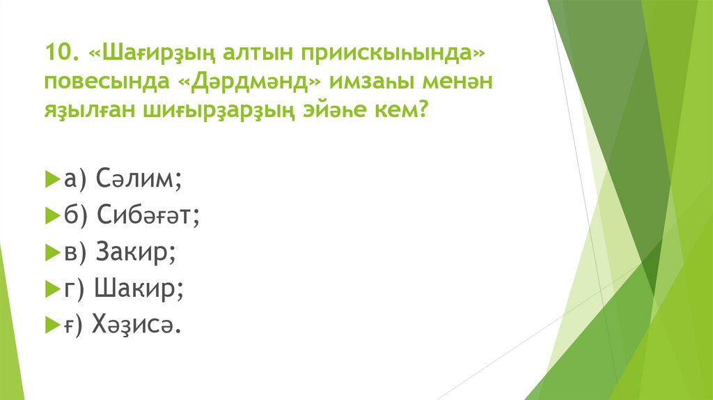 10. «Шағирҙың алтын приискыһында»повесында «Дәрдмәнд» имзаһы менән