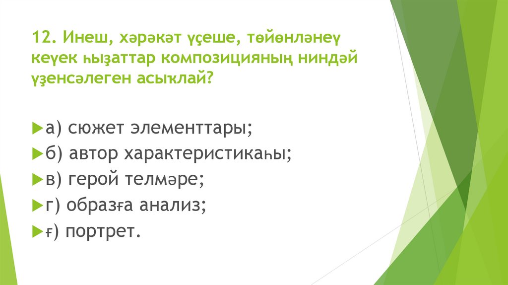 12. Инеш, хәрәкәт үҫеше, төйөнләнеүкеүек һыҙаттар композицияның ниндәй
