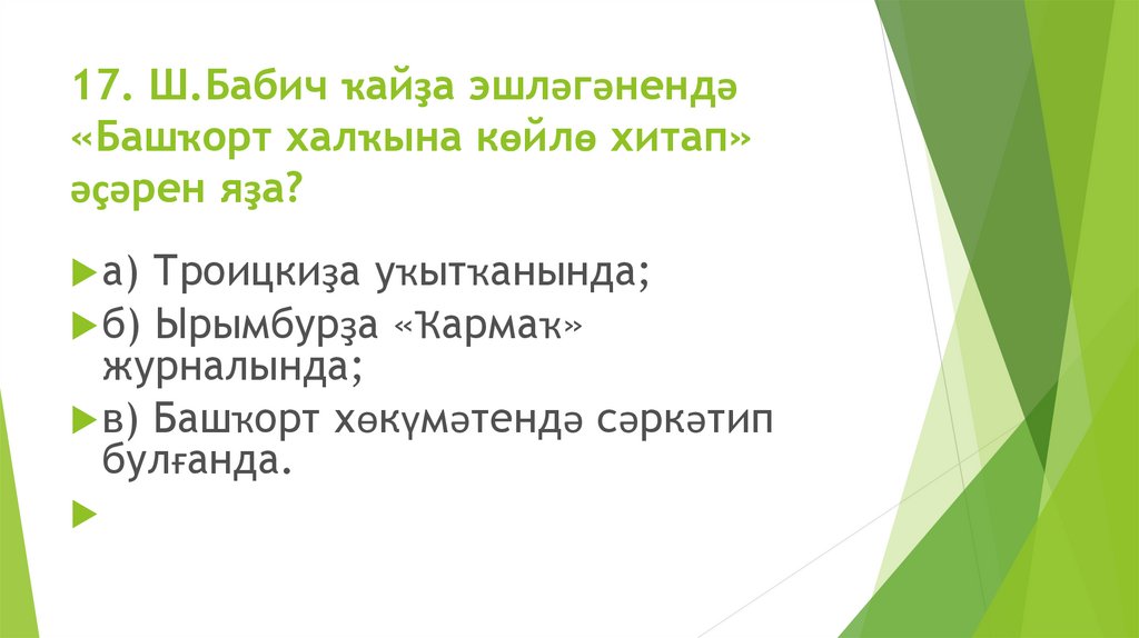 17. Ш.Бабич ҡайҙа эшләгәнендә«Башҡорт халҡына көйлө хитап»
