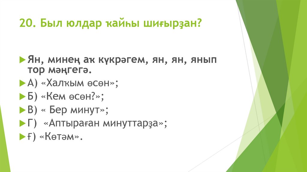 20. Был юлдар ҡайһы шиғырҙан?Ян,