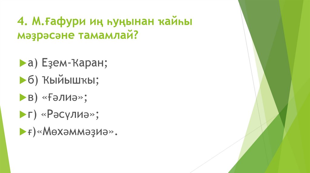 4. М.Ғафури иң һуңынан ҡайһымәҙрәсәне тамамлай?