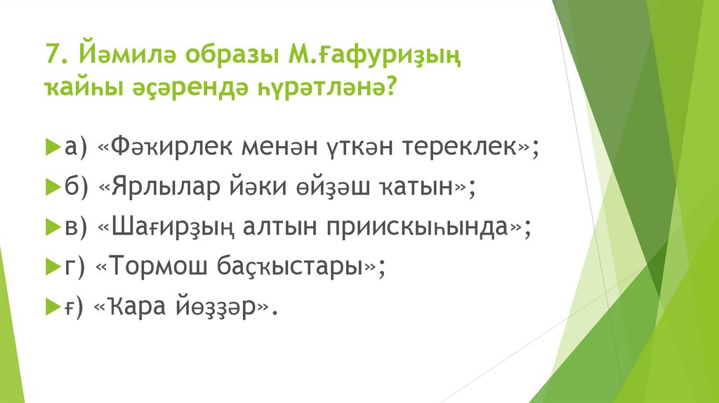 7. Йәмилә образы М.Ғафуриҙыңҡайһы әҫәрендә һүрәтләнә?