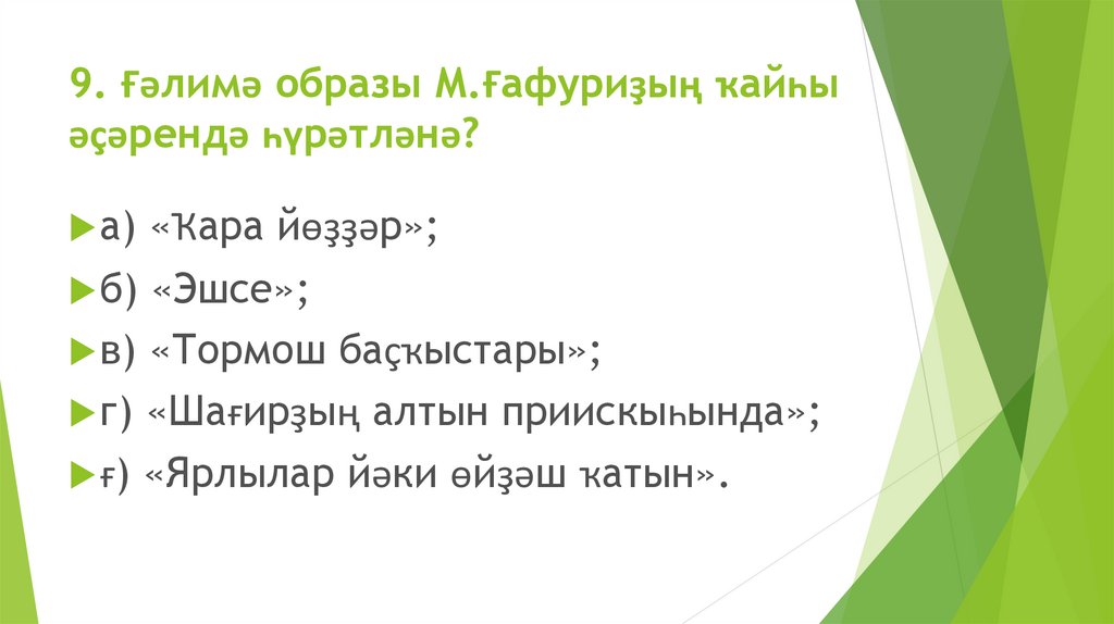 9. Ғәлимә образы М.Ғафуриҙың ҡайһыәҫәрендә һүрәтләнә?