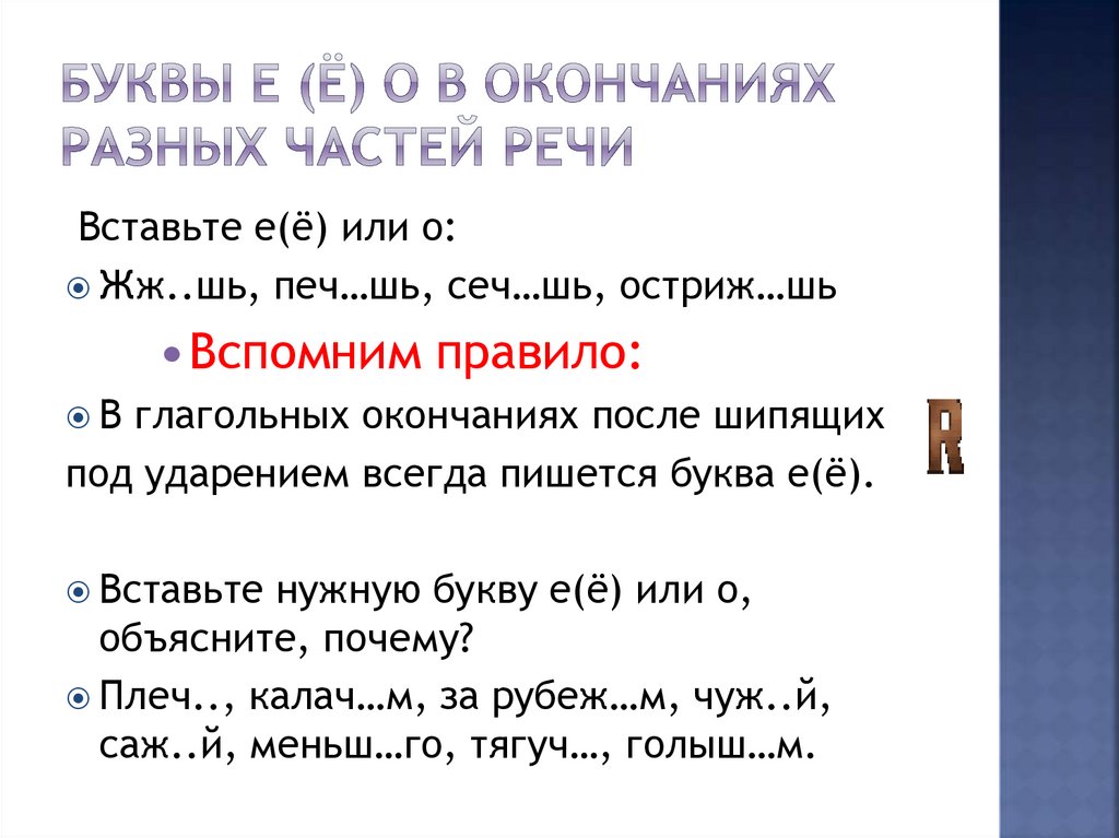 Вставьте е(ё) или о:Жж..шь, печ…шь, сеч…шь, остриж…шь