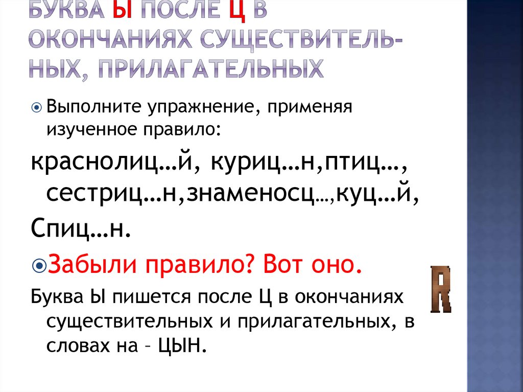 Буква Ы пишется после Ц в окончаниях