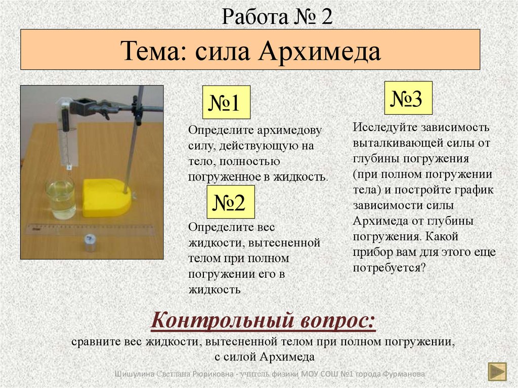 сравните вес жидкости, вытесненной телом при полном погружении,