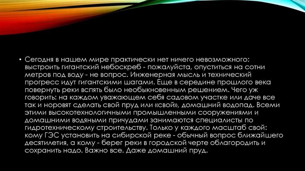 гидротехническому строительству. Только у каждого масштаб свой: