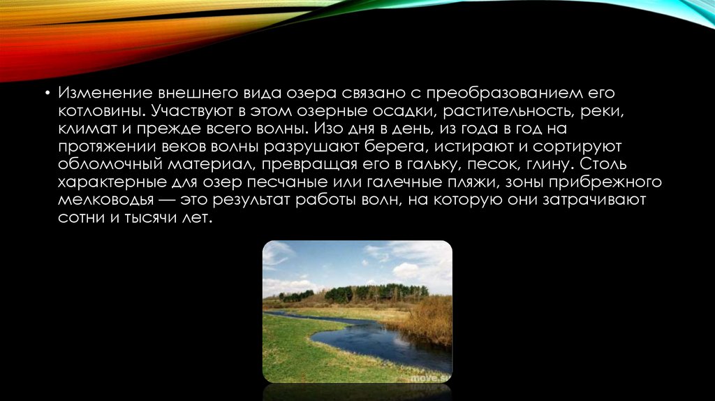 • Изменение внешнего вида озера связано с преобразованием егокотловины. Участвуют в этом озерные осадки, растительность, реки,