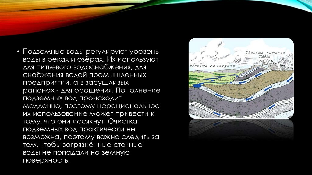 • Подземные воды регулируют уровеньводы в реках и озёрах. Их используют