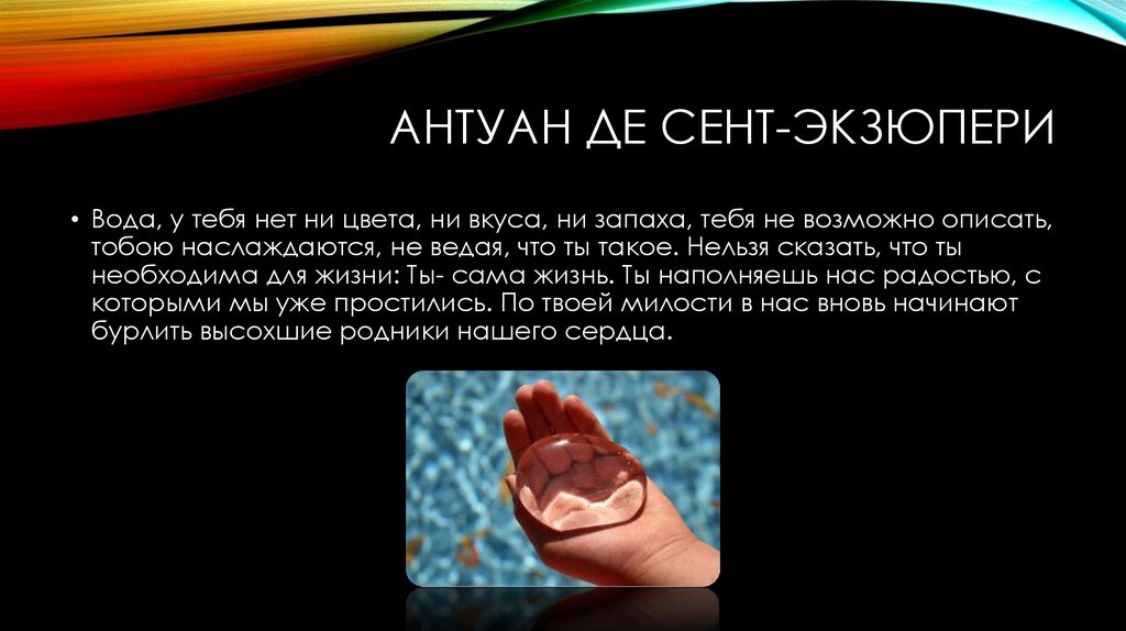 АНТУАН ДЕ СЕНТ-ЭКЗЮПЕРИ• Вода, у тебя нет ни цвета, ни вкуса, ни запаха, тебя не возможно описать,