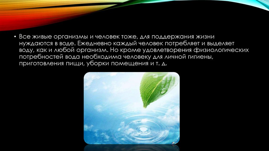 • Все живые организмы и человек тоже, для поддержания жизнинуждаются в воде. Ежедневно каждый человек потребляет и выделяет
