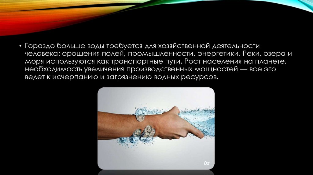 • Гораздо больше воды требуется для хозяйственной деятельностичеловека: орошения полей, промышленности, энергетики. Реки, озера и