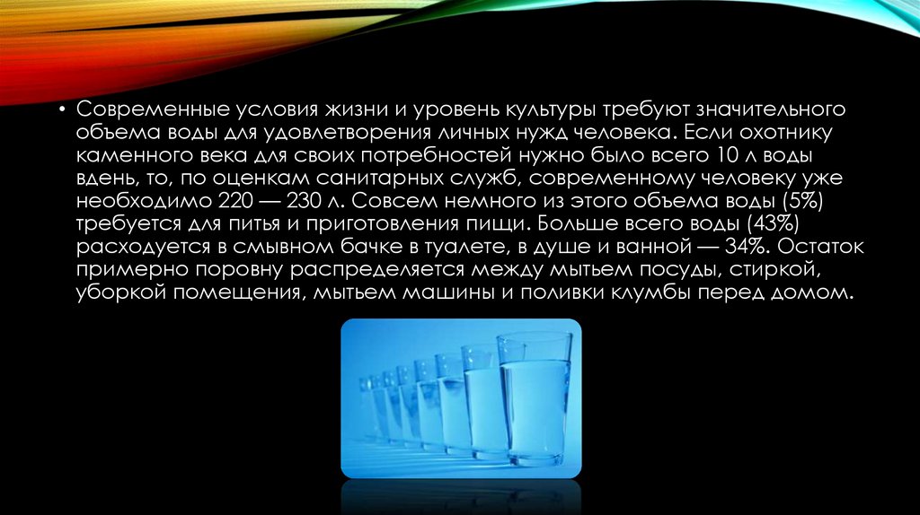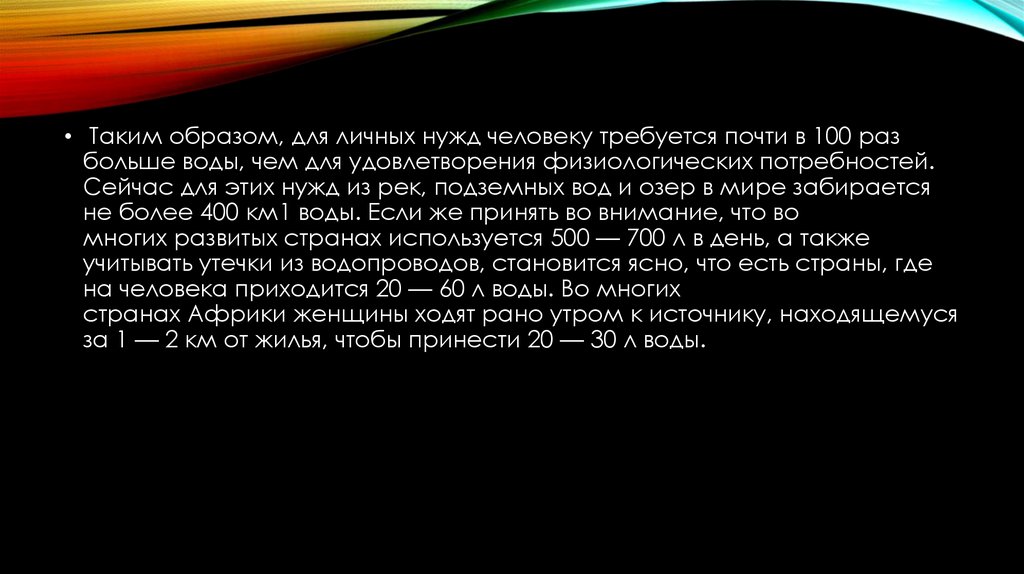 • Таким образом, для личных нужд человеку требуется почти в 100 разбольше воды, чем для удовлетворения физиологических потребностей.