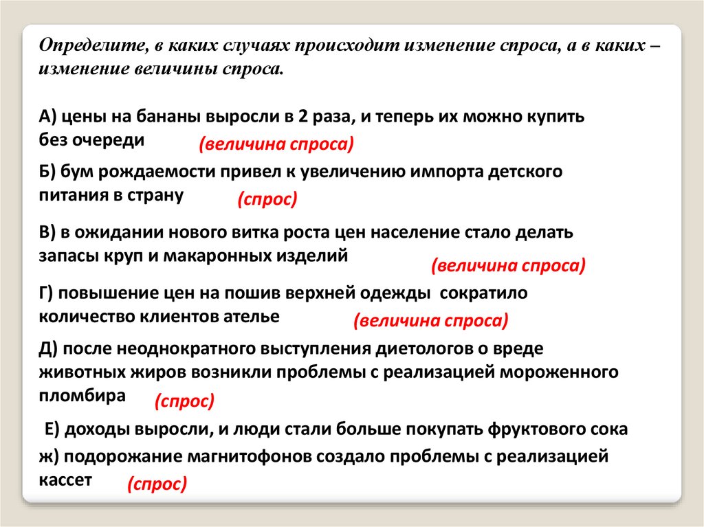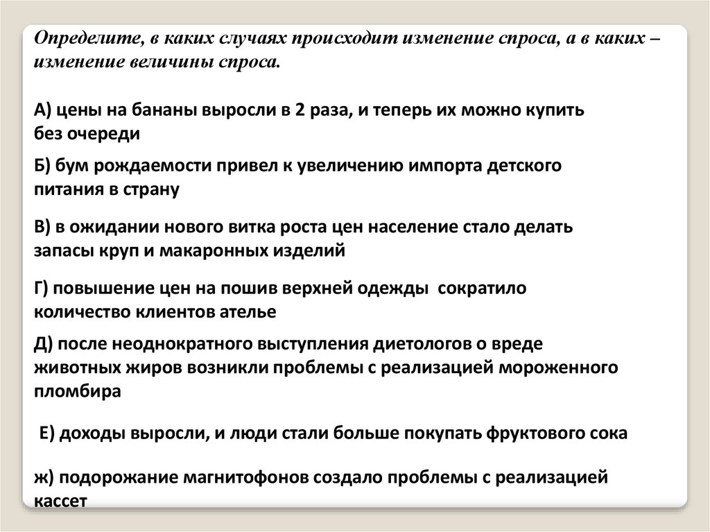 Определите, в каких случаях происходит изменение спроса, а в каких –изменение величины спроса.