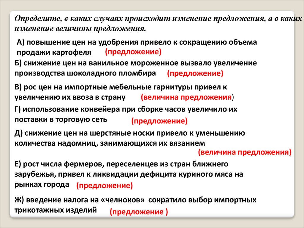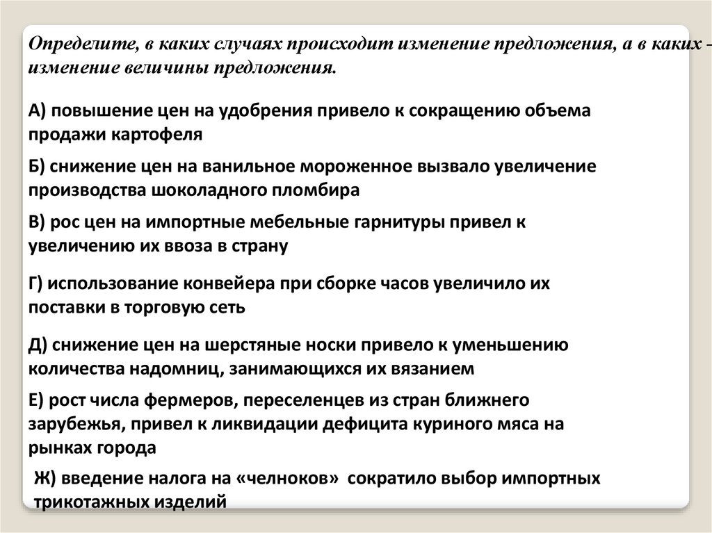 Определите, в каких случаях происходит изменение предложения, а в каких –изменение величины предложения.