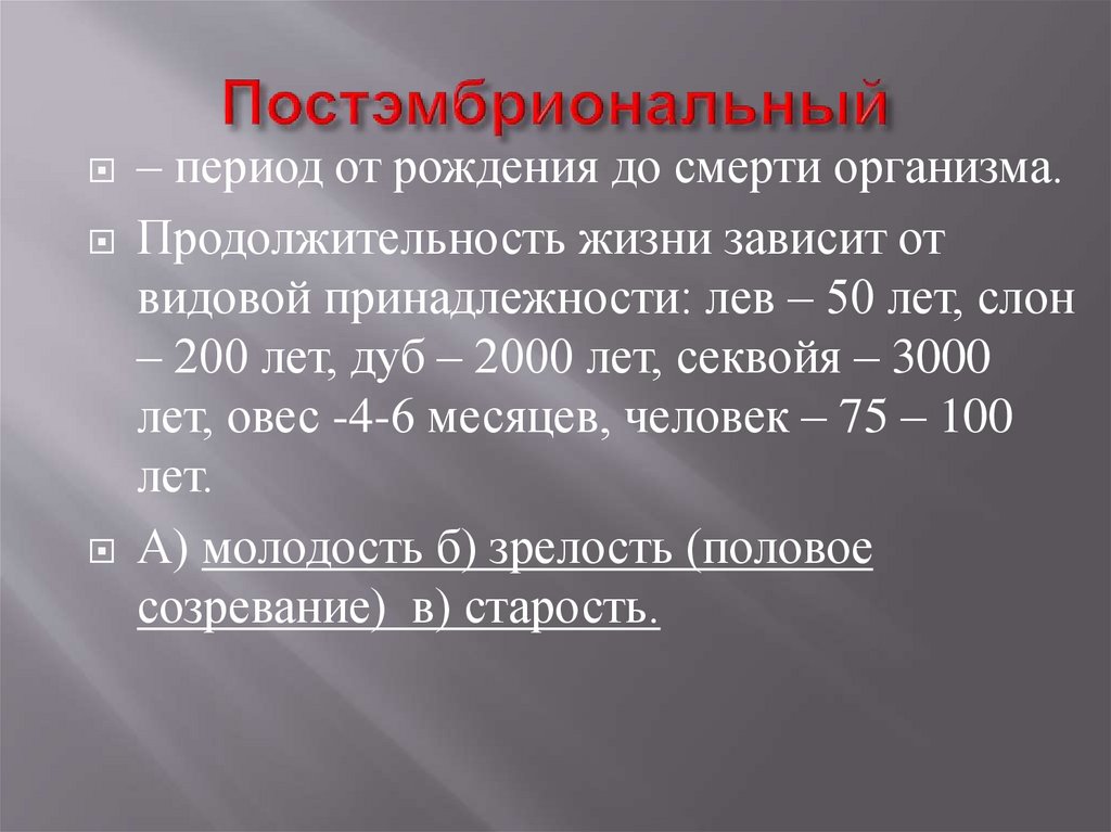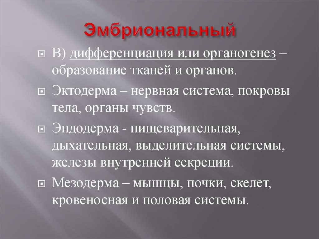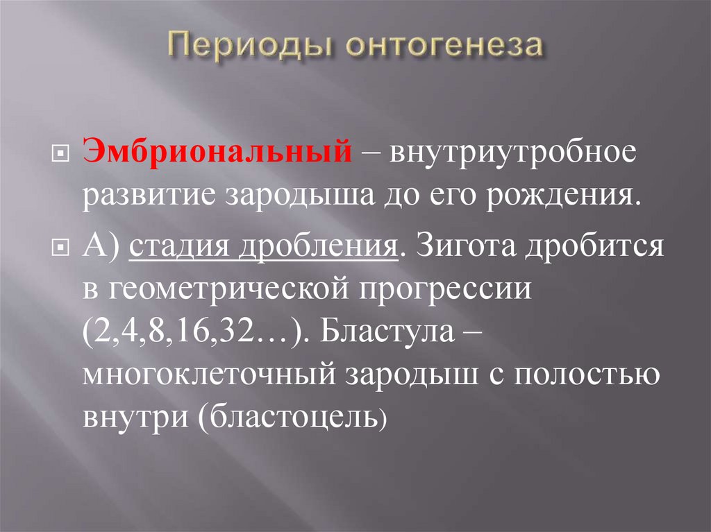 Эмбриональный – внутриутробноеразвитие зародыша до его рождения.